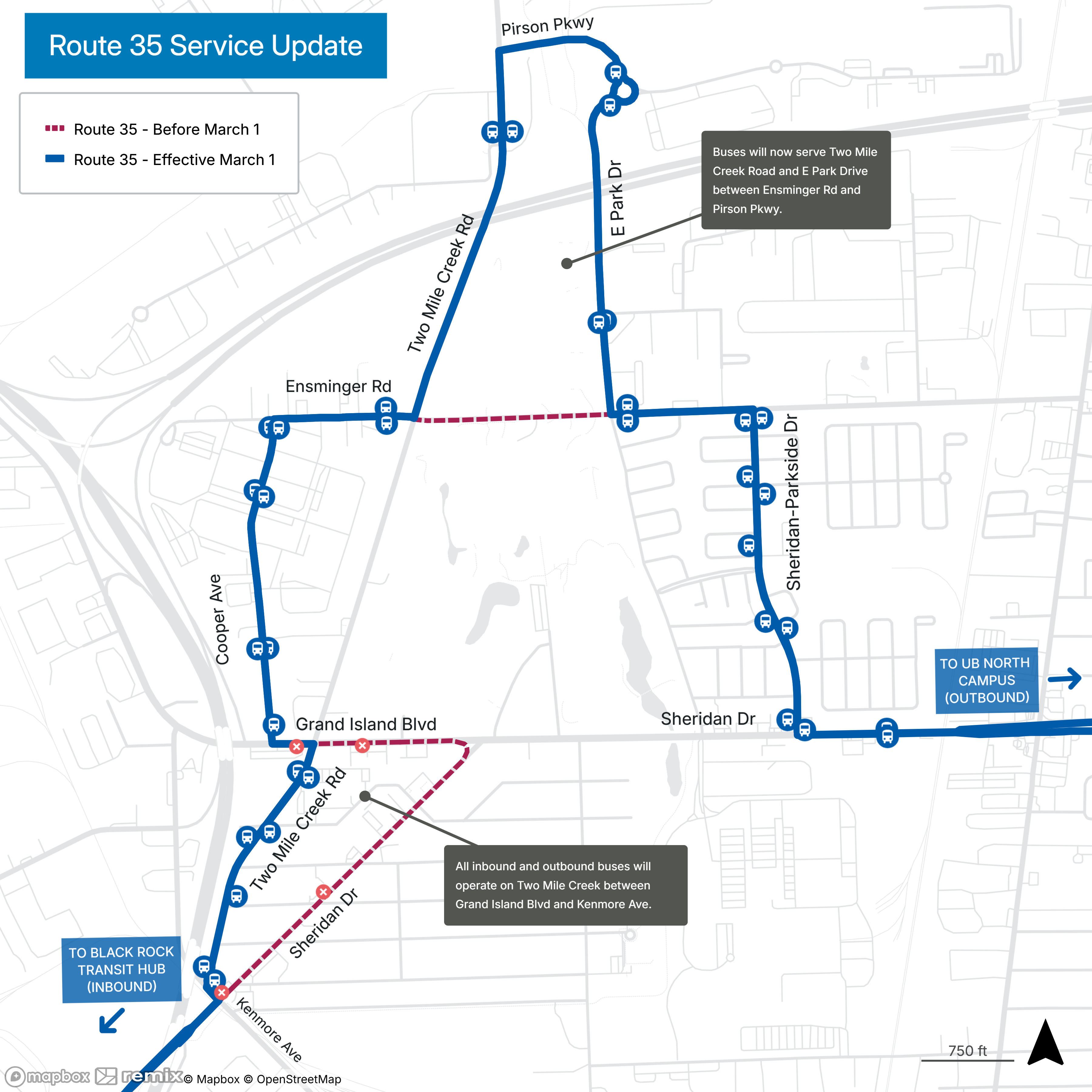 Starting March 1st, Route 35 buses will now serve Two Mile Creek Road and East Park Drive between Ensminger Road and Pirson Parkway. There is also a minor route modification at Grand Island Boulevard and Sheridan Drive.